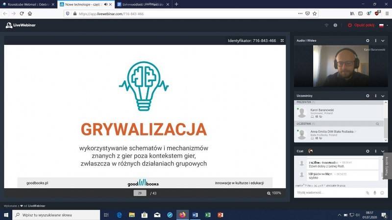 30 czerwca i 1 lipca 2020 r. miało miejsce dwudniowe szkolenie pt. „Nowe technologie w animacji czytelnictwa. Aplikacje, narzędzia, multimedia, gamifikacja – warsztat praktyczny” Szkolenie realizowane było przez wrocławską firmę GoodBooks, szkolącą bibliotekarzy, wydawców, księgarzy i nauczycieli. Prowadził je Pan Karol Baranowski – bibliotekarz w Pedagogicznej Bibliotece Wojewódzkiej w Krakowie oraz w agendzie Arteteka Wojewódzkiej Biblioteki Publicznej w Krakowie, zdobywca tytułu Ogólnopolski Bibliotekarz Roku 2019 w konkursie Stowarzyszenia Bibliotekarzy Polskich, specjalista w zakresie nowych technologii.
