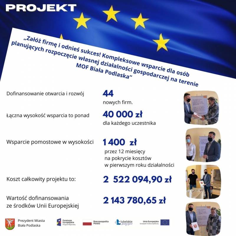 Uczestnicy realizowanego przez miasto projektu: „Załóż firmę i odnieś sukces! Kompleksowe wsparcie dla osób planujących rozpoczęcie własnej działalności gospodarczej na terenie MOF Biała Podlaska” współfinansowanego ze środków Europejskiego Funduszu Społecznego, zostali przeszkoleni i przygotowani do prowadzenia własnej działalności gospodarczej, opracowali biznesplany i wystartowali w konkursie o unijne pieniądze.