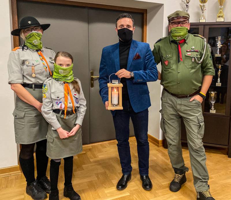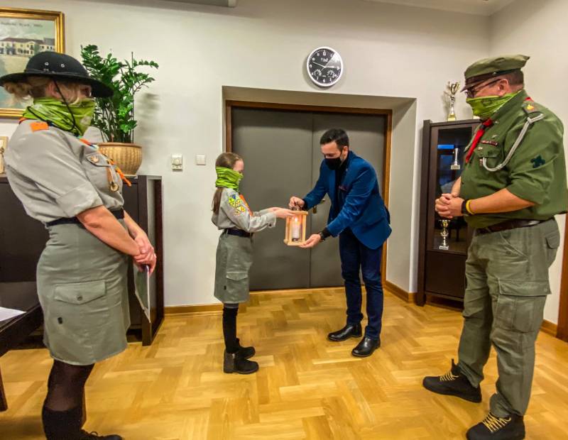 Przedstawiciele naszego bialskiego hufca – komendantka Marta Pomorska, jej zastępca Krzysztof Kowaluk oraz Lenka, przedstawicielka zuchów, przekazali prezydentowi miasta Michałowi Litwiniukowi Betlejemskie Światło Pokoju.
