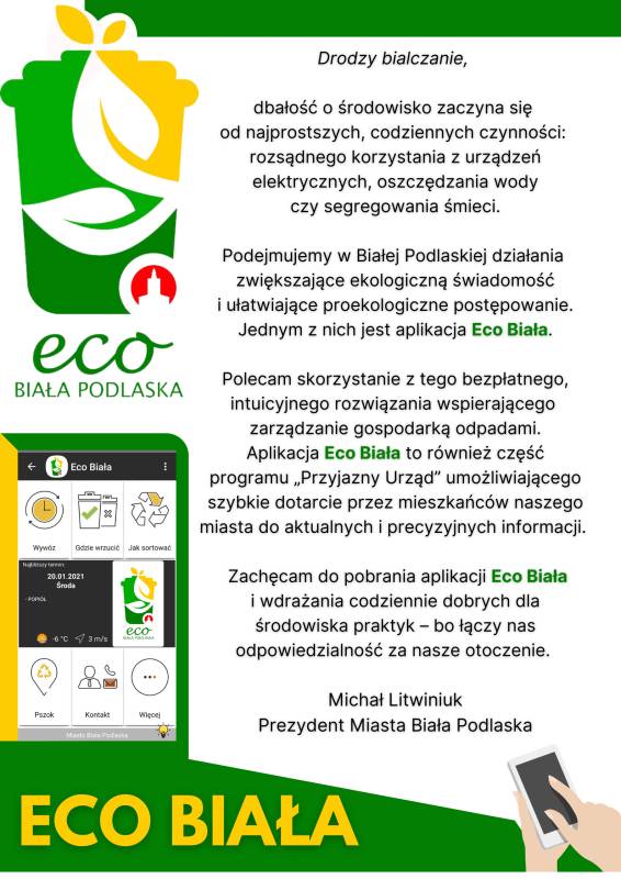 Urząd Miasta Biała Podlaska zachęca do zainstalowania bezpłatnej i bardzo prostej w obsłudze aplikacji Eco Biała.