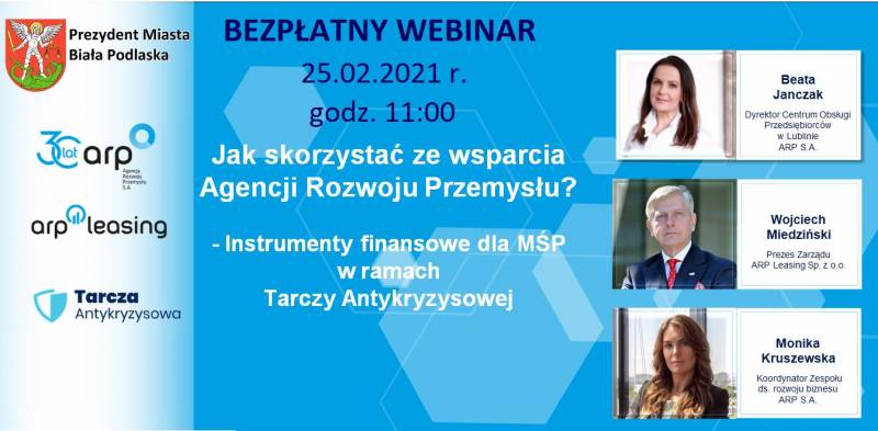 Trzeci webinar z cyklu odbędzie się 25 lutego 2021 roku o godz. 11:00 i skierowany będzie do przedsiębiorców działających na obszarze województwa lubelskiego. Wydarzenie będzie poświęcone instrumentom wsparcia finansowego dla małych i średnich przedsiębiorców oferowanym przez Agencję Rozwoju Przemysłu w ramach Tarczy Antykryzysowej.