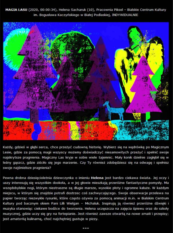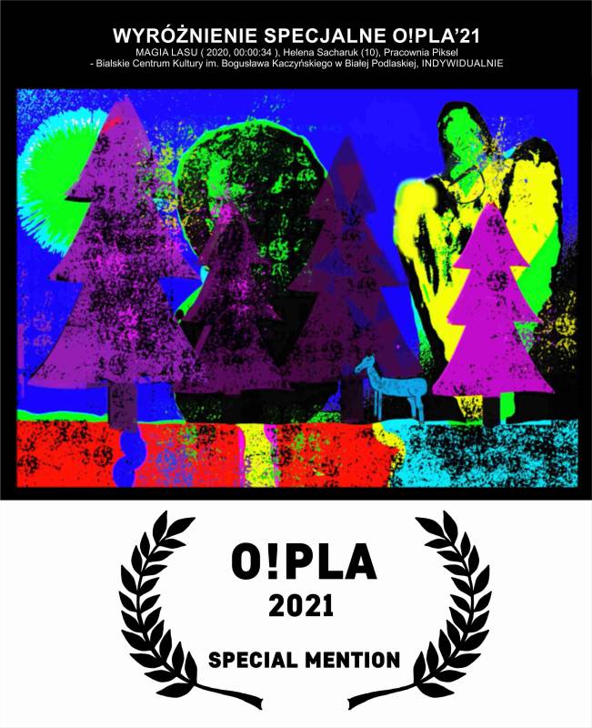 Z radością dzielimy się informacją, że na IX Ogólnopolskim Festiwalu Animacji O!PLA („O! Polska Animacja"/„Oh! People Love Animation"), nasza podopieczna z Bialskiego Centrum Kultury - Helenka Sacharuk otrzymała WYRÓŻNIENIE SPECJALNE w kategorii konkursowej TERAZ MY za „Magię lasu", film stworzony pod opieką artystyczną Lilli Wielgan-Michaluk z Pracowni „Piksel"!!!