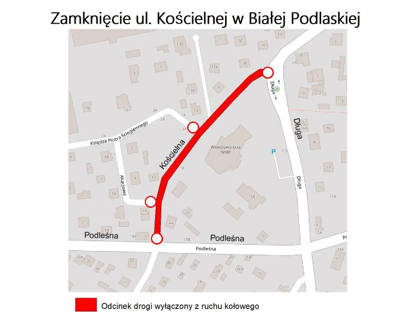 W związku z rozpoczęciem robót drogowych - wykonaniem nakładki bitumicznej na ul. Kościelnej na odcinku od ul. Podleśnej do ul. Długiej, w dniach 24.09.2021-29.09.2021 w/w fragment drogi zostanie czasowo wyłączony z ruchu pojazdów.