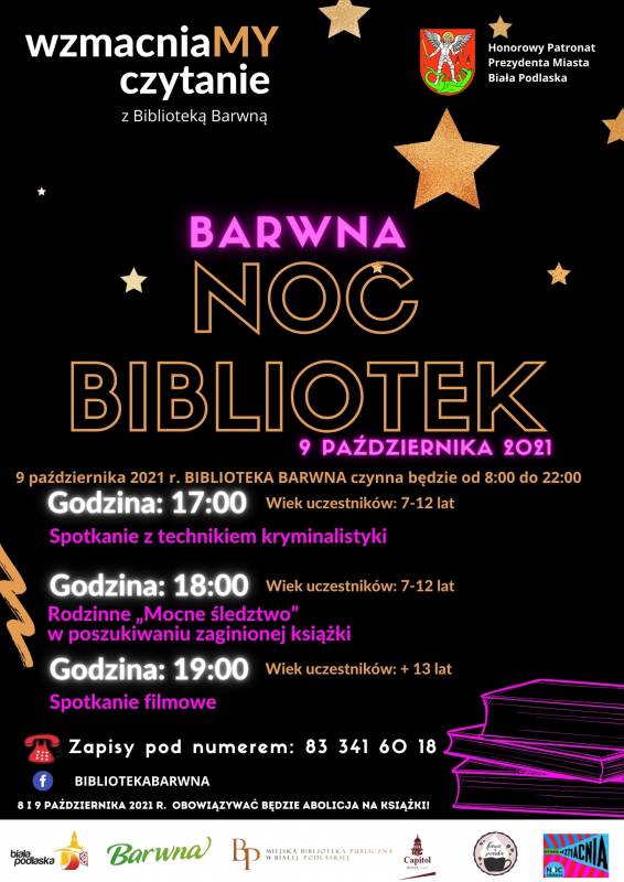 W Barwnej Multimedialnej Bibliotece dla Dzieci i Młodzieży zgodnie z tegorocznym hasłem Nocy Bibliotek .: „Czytanie wzmacnia” będzie szansa udowodnić, że czytelnicy Biblioteki Barwnej są mocni w każdej z dziedzin. O godzinie 17: 00 w Multicentrum odbędzie się spotkanie z technikiem kryminalistyki, który wprowadzi dzieci w tajniki swojej niezwykłej pracy. Następnie wszyscy uczestnicy bogatsi o wiedzę, jaka została im przekazana przez kryminologa, wezmą udział w emocjonującej grze tropem zagadek. Wspólnie przeprowadzimy „Mocne śledztwo” w poszukiwaniu zaginionej książki. Po udanym śledztwie proponujemy wzmacniający pokaz filmowy.