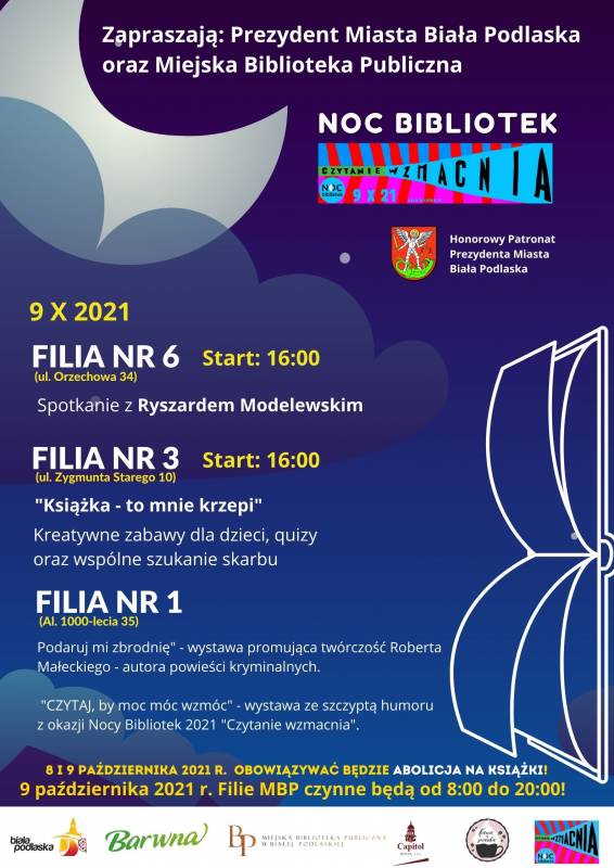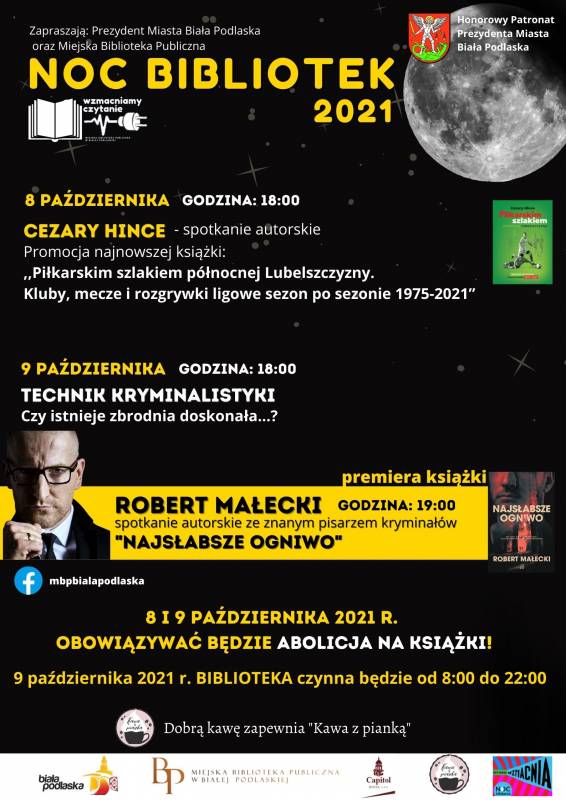 Prezydent Miasta Biała Podlaska oraz Miejska Biblioteka Publiczna w Białej Podlaskiej serdecznie zapraszają na Noc Bibliotek 2021, która odbędzie się 8-9 października br. Hasłem tegorocznej edycji jest „Czytanie wzmacnia” które ma na celu promocję czytelnictwa. Tegoroczna akcja będzie wyjątkowa ze względu na spotkanie autorskie z Robertem Małeckim – jednym z czołowych polskich pisarzy literatury sensacyjnej oraz kryminalnej. Autor będzie promował swoją najnowszą książkę „ Najsłabsze ogniwo”, która ukazała się we wrześniu bieżącego roku.