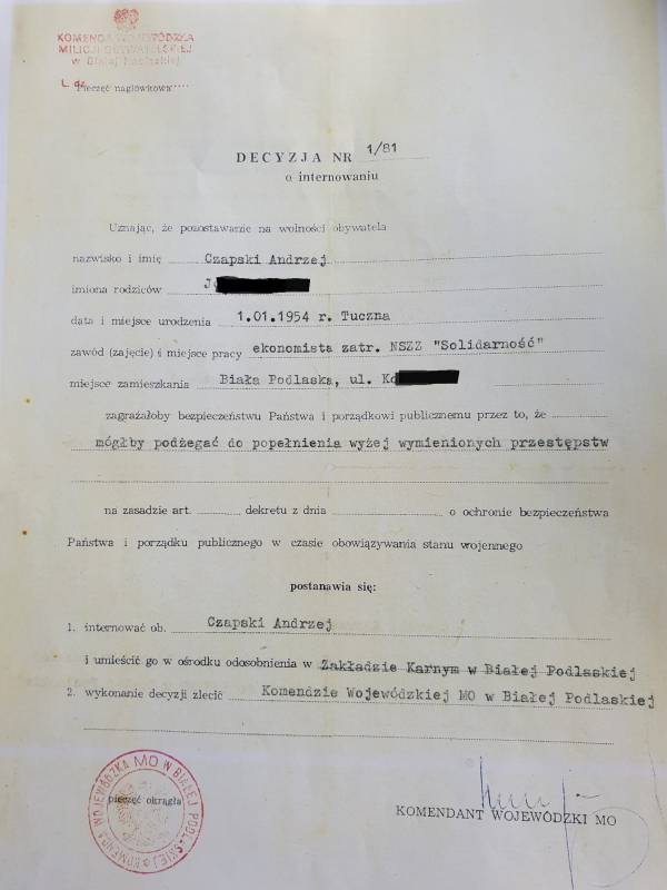 Pan Andrzej Czapski jako działacz Solidarności został internowany w nocy z 12/13 grudnia 1981 r. To właśnie doświadczeniami okresu stanu wojennego podzielił się z  uczniami z klas humanistycznych (na początku z klasą III Ag, a następnie z klasą III A). Pan Andrzej Czapski także przekazał szkole kopie dokumentów związanych z internowaniem oraz okresem PRL.