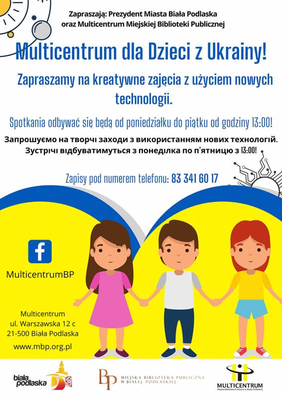 Od 7 marca br. Multicentrum Miejskiej Biblioteki Publicznej w Białej Podlaskiej, organizuje bezpłatne zajęcia z użyciem nowych technologii dla dzieci z Ukrainy. Zajęcia odbywać się będą od poniedziałku do piątku od godziny 13:00. Pracownicy miejskiej instytucji kultury przygotowali wiele kreatywnych zadań m.in.: naukę programowania od podstaw, wspólne tworzenie torów przeszkód dla robotów czy też zajęcia plastyczne. Placówka przyjmuje zgłoszenia pod numerem telefonu: 83 341 60 17. Serdecznie zapraszamy do skorzystania z oferty.