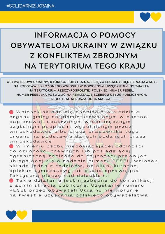 Numery PESEL dla obywateli Ukrainy - w związku z konfliktem zbrojnym na terytorium tego państwa można będzie uzyskać od 16 marca br. w Urzędzie Miasta Biała Podlaska.