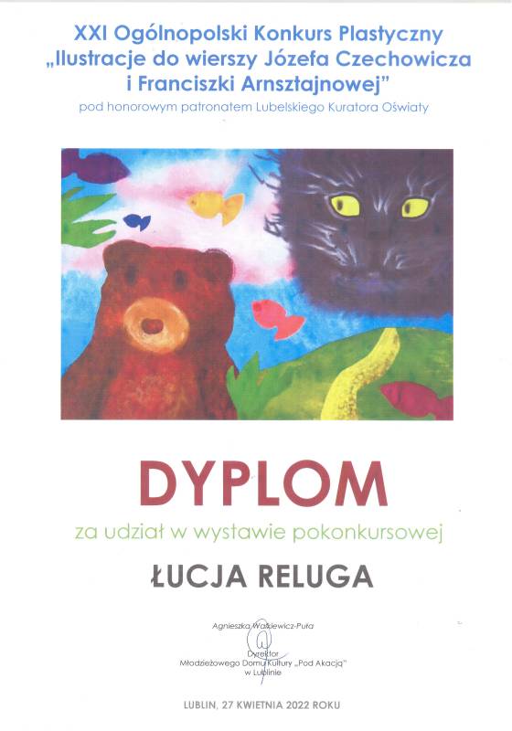 Miło nam poinformować, że młodzi artyści z Pracowni Grafiki Komputerowej„Piksel", zatriumfowali na XXI Ogólnopolskim Konkursie Plastycznym "Ilustracje do wierszy Józefa Czechowicza i Franciszki Arnsztajnowej" pod patronatem Lubelskiego Kuratora Oświaty.