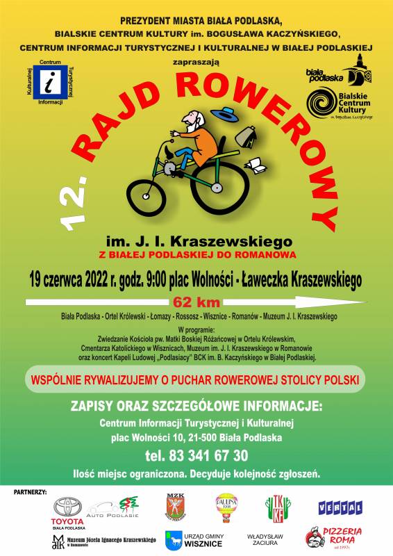 Serdecznie zapraszamy do udziału w 12. Rajdzie Rowerowy im. J. I. Kraszewskiego z Białej Podlaskiej do Romanowa, który odbędzie się 19 czerwca 2022 r. Spotykamy się przy Ławeczce J. I. Kraszewskiego na placu Wolności o godz. 9:00, skąd wyruszymy w 62 kilometrową podróż, włączając się we wspólne zmagania rywalizacji o Puchar Rowerowej Stolicy Polski.