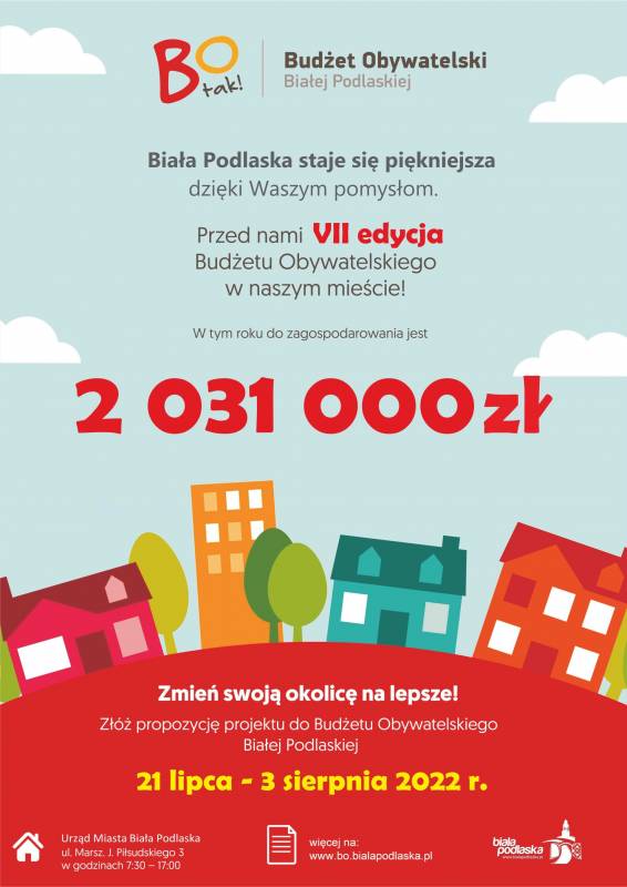 W budżecie obywatelskim uczestniczą mieszkańcy Białej Podlaskiej figurujący na liście uprawnionych do udziału w budżecie obywatelskim Białej Podlaskiej. Lista tworzona jest na podstawie: bazy danych osób zameldowanych w mieście Biała Podlaska, listy osób wpisanych do rejestru wyborców w mieście Biała Podlaska. Mieszkańcy miasta nie figurujący na liście uprawnionych do udziału w budżecie obywatelskim Białej Podlaskiej mogą dopisać się do niej poprzez złożenie stosownego oświadczenia o zamieszkaniu, które należy złożyć osobiście w Urzędzie Miasta Biała Podlaska lub w trakcie głosowania w punktach do głosowania. Na udział w budżecie obywatelskim osoby małoletniej zgodę wyraża rodzic lub opiekun prawny wypełniając oświadczenie na karcie zgłoszeniowej, na karcie do głosowania lub potwierdzając głos internetowy. Projekt do realizacji w ramach budżetu obywatelskiego składa osoba uprawniona na formularzu zgłoszenia projektu. Do zgłoszenia należy załączyć mapę lokalizacji z zaznaczonym zakresem projektu oraz kosztorys, w którym należy uwzględnić dokumentację projektową oraz oznakowanie rezultatu informacją o źródle finansowania. Dla ważności zgłoszenia, konieczne jest poparcie projektu przez co najmniej 20 uprawnionych mieszkańców miasta. Formularz zgłoszenia projektu należy złożyć w formie papierowej w Urzędzie Miasta Biała Podlaska, ul. Marszałka Józefa Piłsudskiego 3, 21-500 Biała Podlaska lub za pośrednictwem platformy ePUAP w terminie od 21 lipca do 3 sierpnia 2022 r.