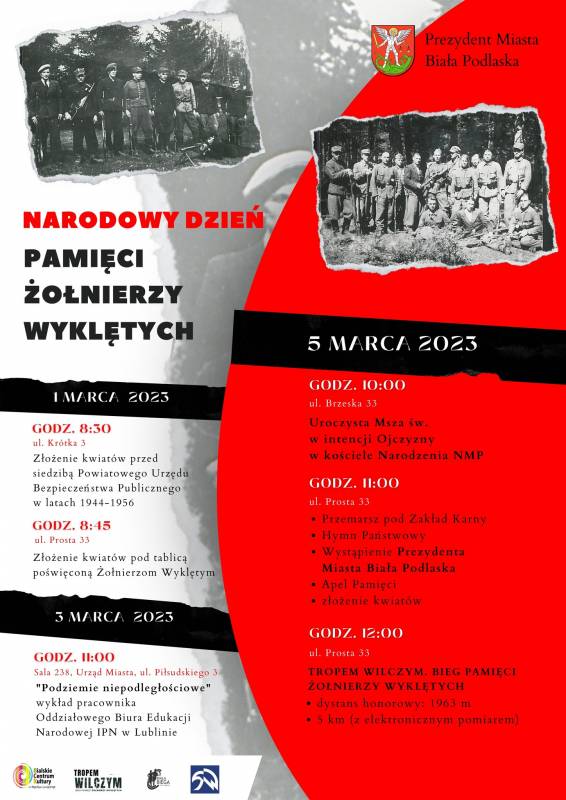 We środę 1 marca br. o godz. 8.30 i 8.45 nastąpi złożenie kwiatów przy ul. Krótkiej 3, przed budynkiem Powiatowego Urzędu Bezpieczeństwa, miejscem kaźni w latach 1944-1956, oraz przy ul. Prostej 33, pod tablicą poświęconą żołnierzom wyklętym.