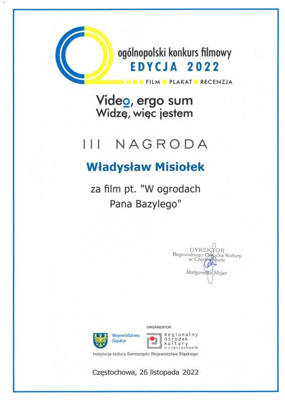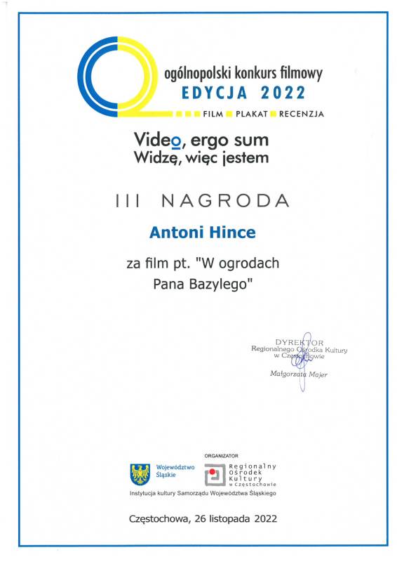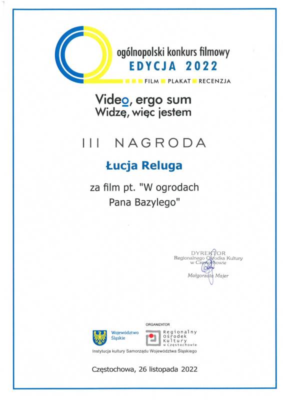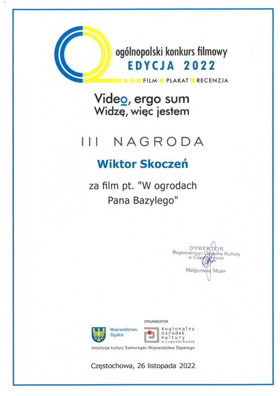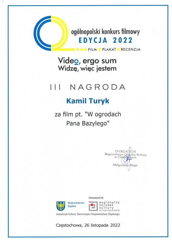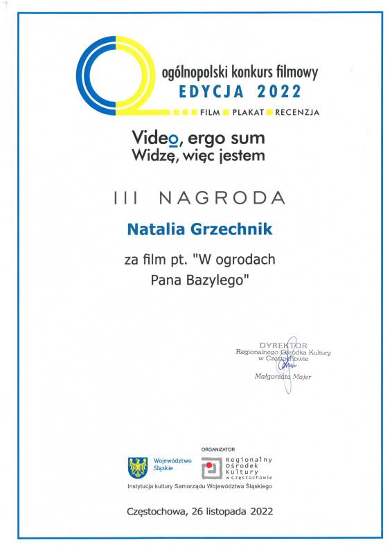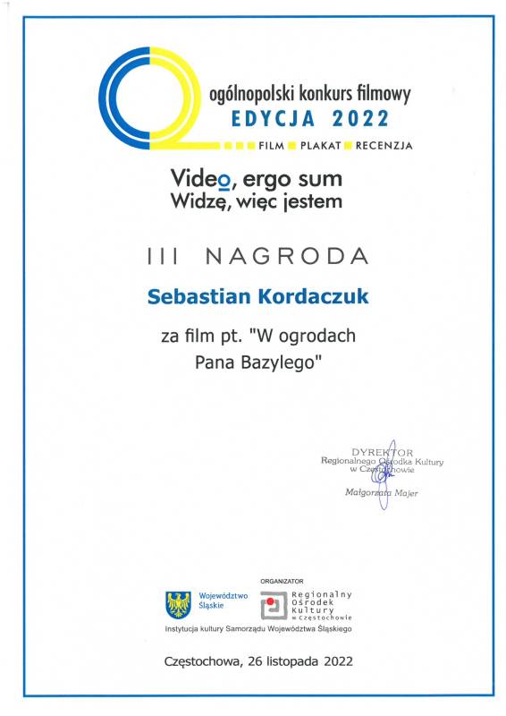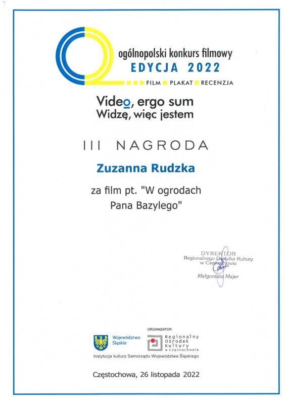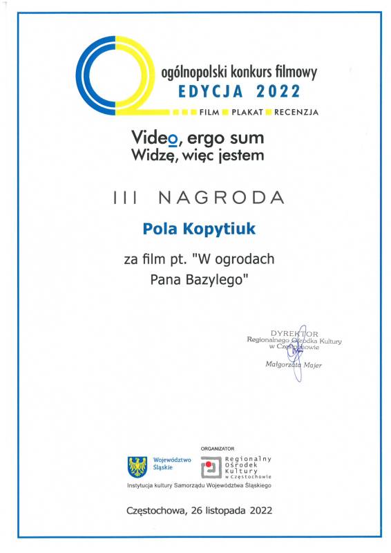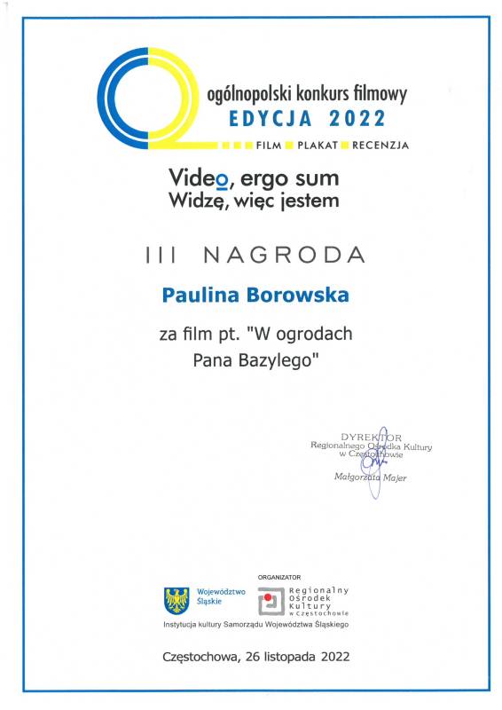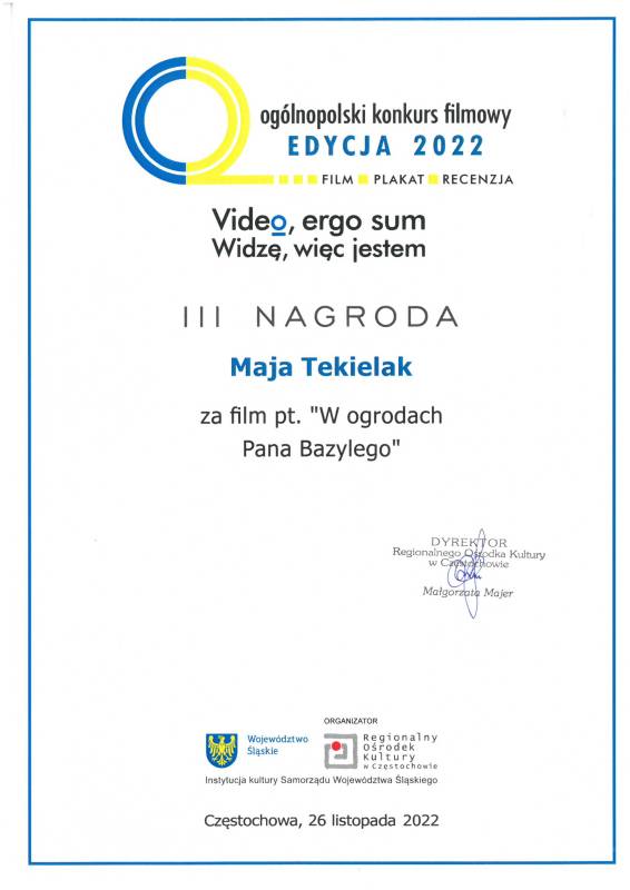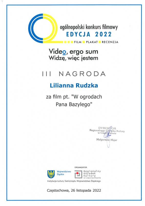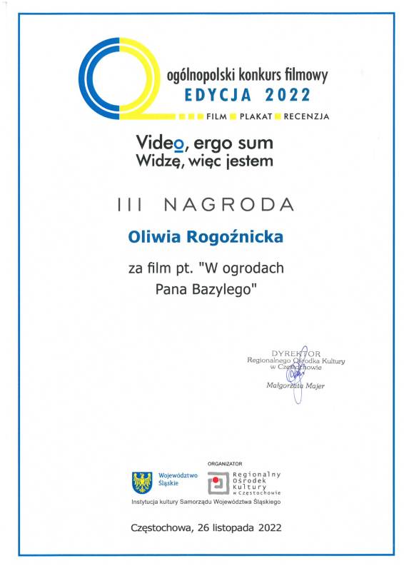 Miło nam poinformować że nasi młodzi artyści z Pracowni Grafiki Komputerowej „Piksel", prowadzonej przez panią Lillę Wielgan-Michaluk zostali uhonorowani kolejną nagrodą za film „W ogrodach Pana Bazylego" w Ogólnopolskim Konkursie Filmowym ,,Video, ergo sum - Widzę, więc jestem".