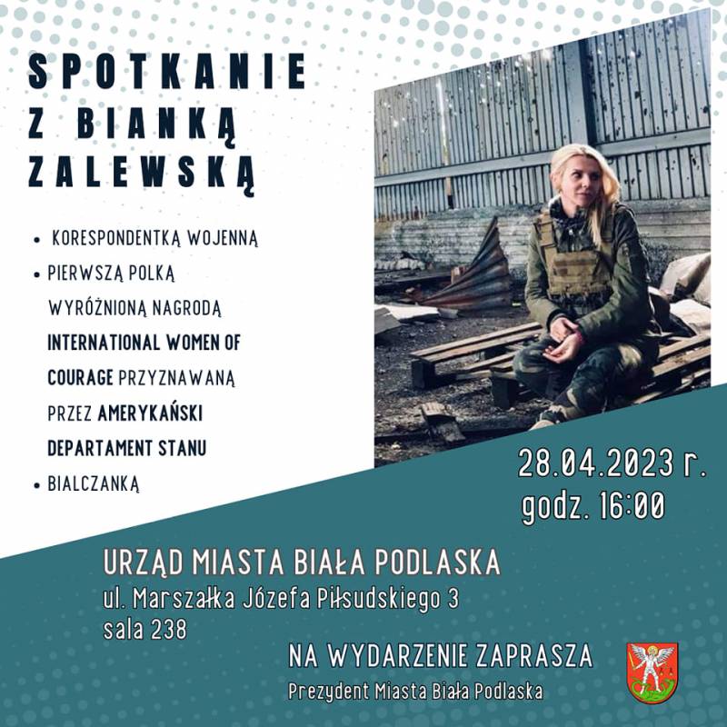 Prezydent Michał Litwiniuk zaprasza na spotkanie otwarte z Bianką Zalewską, korespondentką wojenną, pierwszą Polką wyróżnioną nagrodą International Women of Courage przyznawaną przez amerykański Departament Stanu, bialczanką.