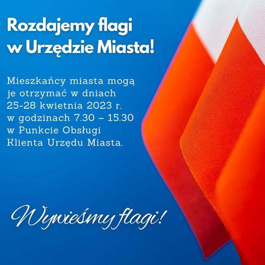 Wraz z prezydentem Michałem Litwiniukiem zachęcamy do wywieszenia flagi podczas majowych świąt i zademonstrowania w ten sposób naszego patriotyzmu oraz przywiązania do symboli narodowych. Flagi będzie można otrzymać w Punkcie Obsługi Klienta Urzędu Miasta (ul. Marszałka Józefa Piłsudskiego 3) w dniach 25-28 kwietnia 2023 r. w godzinach 7.30 – 15.30.