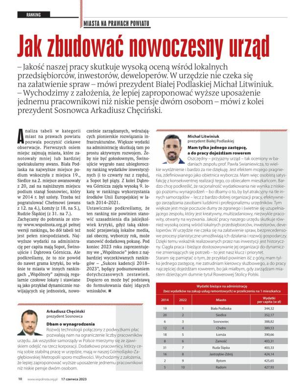 Michał Litwiniuk dla „Wspólnoty”: Oszczędny - przyjazny urząd: tak oceniony w badaniach zespołu prof. Pawła Swianiewicza, to wielkie wyróżnienie i bardzo za nie dziękuję. Jest efektem mojego pragnienia, zdefiniowanego jako obietnica wyborcza. Mam więc osobistą satysfakcję z konsekwentnej realizacji tego, co obiecałem mieszkańcom. To jest też sposób okazania wdzięczności za zaufanie, jakim zostałem obdarzony, bo bialczanie zasługują na to, by ich samorząd był dobrze zarządzany, skuteczny, ale nie kosztowny bardziej niż to konieczne. Za przyjazną, efektywną i niedrogą administrację jestem wdzięczny wszystkim pracownikom urzędu – bardzo zaangażowanym, specjalistom w swoich dziedzinach. To tym bardziej istotne, że każdy samorządowiec boryka się z problemem fluktuacji i niedoborem kadr. Ja zaś bardzo chcę podkreślić, że racjonalność wydatkowania nie wynika z niskiego poziomu wynagrodzeń – bo dbamy o to, by był atrakcyjny na tle innych samorządów – lecz z bardzo dobrej organizacji pracy, efektywnego zarządzania zasobami ludzkimi i profesjonalizmu urzędników. Tym większe jest moje poczucie dumy ze zgranego i świetnie się uzupełniającego zespołu, który jest kreatywny, multizadaniowy, niezwykle pracowity, otwarty na wyzwania. Jakość pracy naszego urzędu skutkuje również wysoką oceną wśród lokalnych przedsiębiorców, inwestorów, developerów. W urzędzie nie czeka się na załatwienie spraw, bezprecedensowe procesy planistyczne umożliwiają ich działania i rozwój gospodarczy. Dzięki temu wskaźnik realizowanych przez nas inwestycji jest historyczny. Ciągła praca i bieżące dostosowywanie jej organizacji do dynamicznie zmieniających się potrzeb – to jest nasz klucz i priorytet. Staram się pamiętać o tym, że przykład powinien iść z góry, mam tylko jednego zastępcę, nie zatrudniam kierowcy służbowego, a do pracy najczęściej dojeżdżam rowerem, bo jak miałbym, gdy zarządzam miastem dzierżącym dumnie tytuł Rowerowej Stolicy Polski.