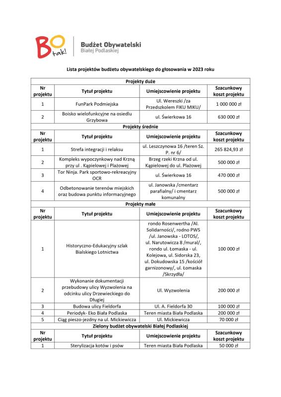 Lista projektów do głosowania dostępna jest na grafikach informacyjnych.