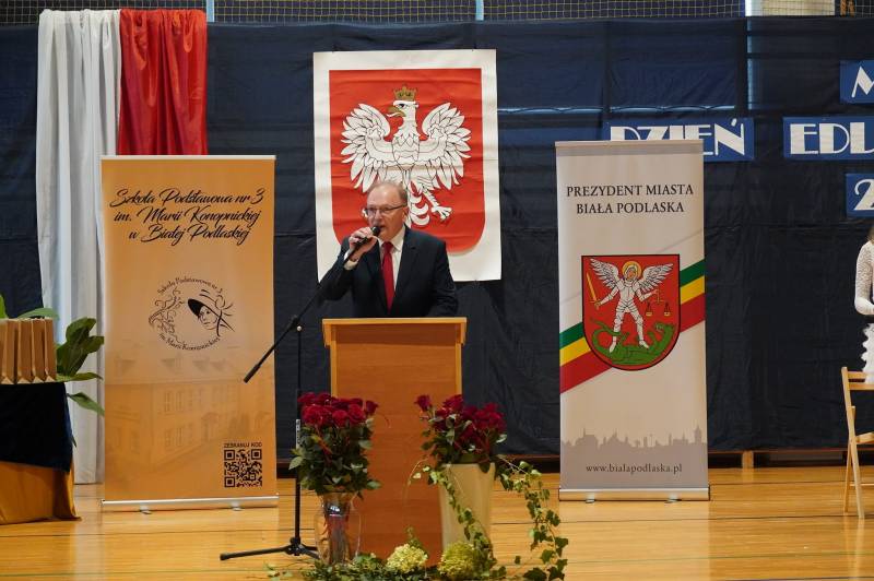 Dziękujemy wszystkim za obecność na naszej uroczystości, na ręce pana naczelnika Wydziału Edukacji, Kultury i Sportu dr. Stanisława Romanowskiego i pani dyrektor Szkoły Podstawowej nr 3 im. Marii Konopnickiej Barbary Wojarnik składamy podziękowania i gratulacje ich zespołom za przygotowanie jej fantastycznej oprawy.