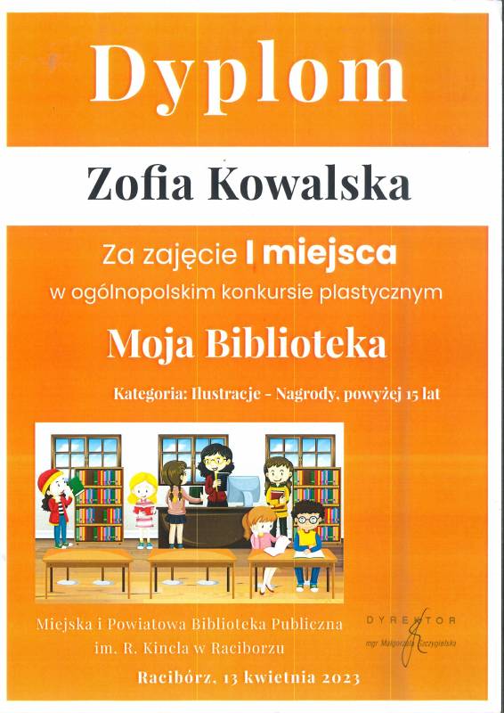 W kwietniu bieżącego roku Zofia została również laureatką Ogólnopolskiego Konkursu Plastycznego "Moja Biblioteka" zorganizowanego przez Miejską i Powiatową Bibliotekę Publiczną im. Ryszarda Kincla w Raciborzu. W kategorii "Ilustracje" - nagrody powyżej 15 lat, Zofia zdobyła I miejsce prezentując pracę rysunkową pt. „Remedium”. W konkursie wzięły udział 452 osoby w wieku od 4 do 88 lat.