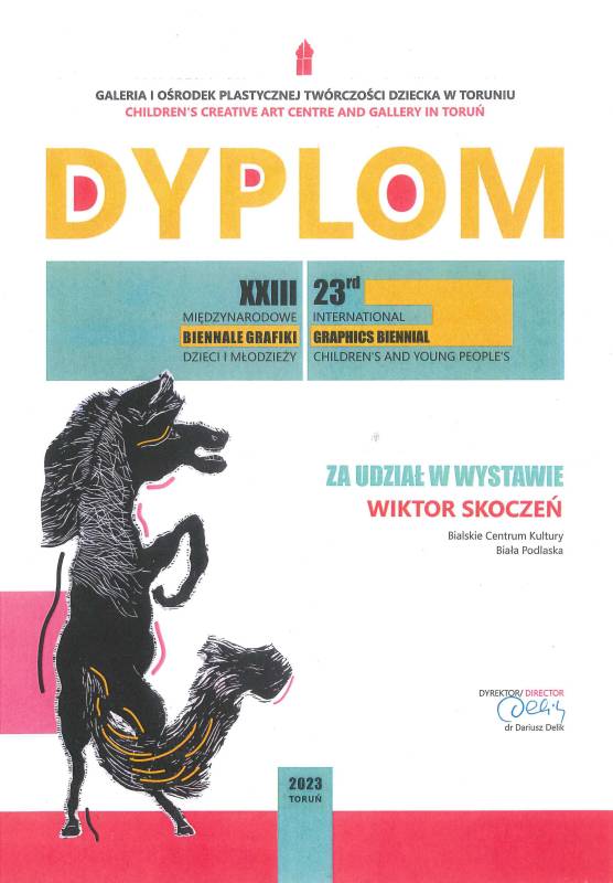 Jest nam niezmiernie miło poinformować, że kwalifikację do wystawy na XXIII Międzynarodowym Biennale Grafiki Dzieci i Młodzieży w Toruniu otrzymał Wiktor Skoczeń, nasz wychowanek z Pracowni Grafiki Komputerowej „Piksel".