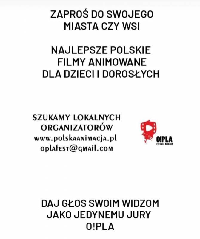 Na przestrzeni minionych lat O!PLA stała się rozpoznawalną i szanowaną na całym świecie marką promującą i wspierającą polską animację. Co roku Jurorami w konkursie są sami widzowie, w różnym wieku, uczestniczący w projekcjach konkursowych, i to właśnie oni decydują do kogo powędrują Tobołki Koziołka Matołka. Od samego początku ambicją O!PLA było docieranie ze sztuką animacji nie tylko do dużych, ale przede wszystkim do mniejszych ośrodków w kraju. Serdecznie zachęcamy bialskie przedszkola, szkoły, biblioteki aby zostały lokalnymi partnerami tego wyjątkowego niezależnego projektu jakim jest O!PLA. Udział w pokazach festiwalowych dla dzieci i młodzieży jest BEZPŁATNY!!!
