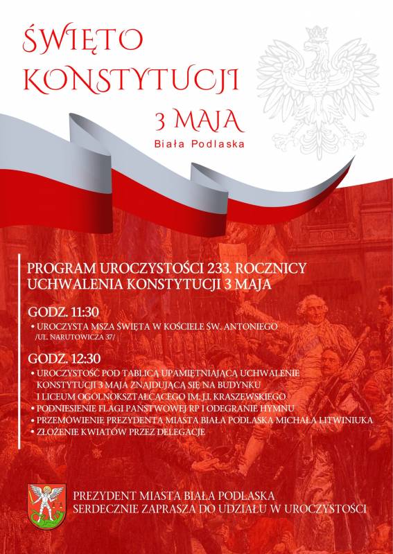 Zapraszamy na miejskie uroczystości związane z obchodami 233. rocznicy uchwalenia Konstytucji 3 maja.