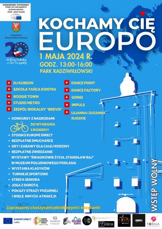 1 maja br. w 20. rocznicę wejścia Polski do Unii Europejskiej spotkajmy się w założeniu zamkowo-parkowym Radziwiłłów na rodzinnym pikniku "Kochamy Cię Europo".