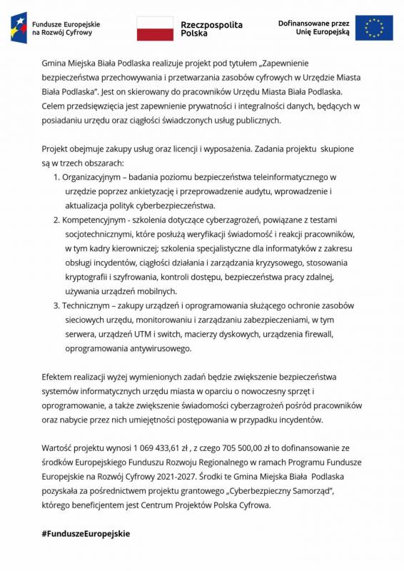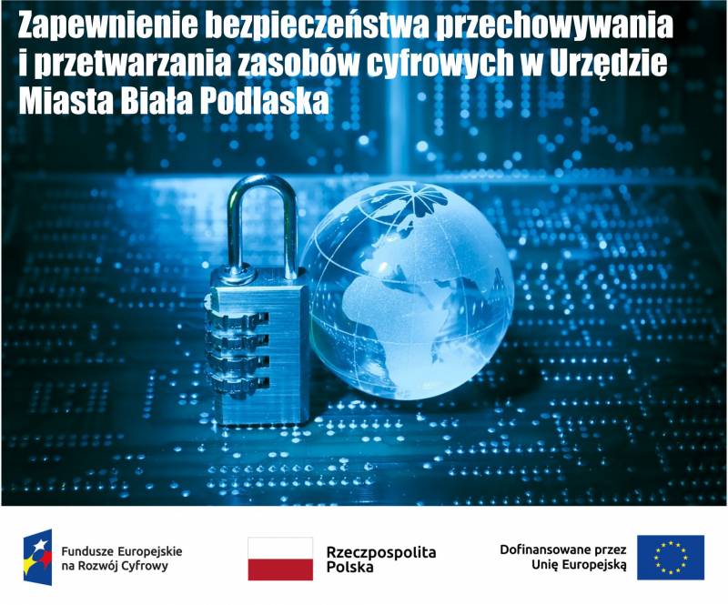 Gmina Miejska Biała Podlaska realizuje projekt pod tytułem „Zapewnienie bezpieczeństwa przechowywania i przetwarzania zasobów cyfrowych w Urzędzie Miasta Biała Podlaska”.
