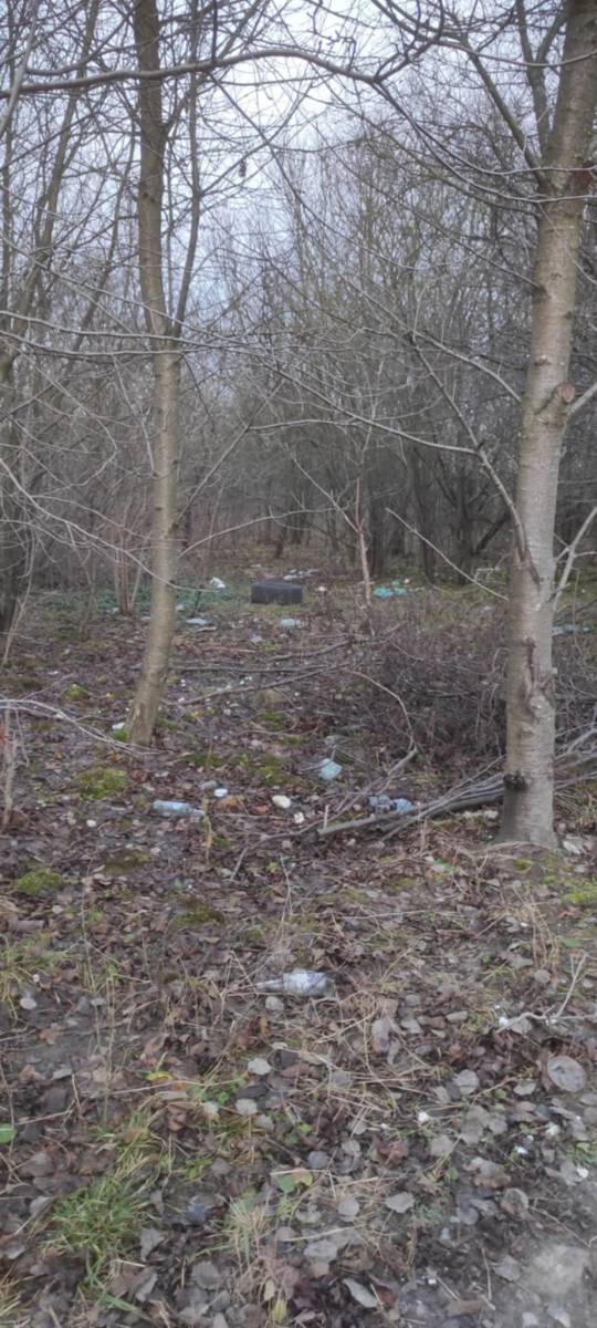 Dzikie wysypisko na ulicy Wereszki. Śmieci,.opony w zaroślach. Cała ulica Wereszki pomiędzy Kościołem a ulica Żeromskiego bardzo mocno zaśmiecona. Miejsce spacerowe okolicznych mieszkańców oraz ich droga do Kościoła wyglądają strasznie.